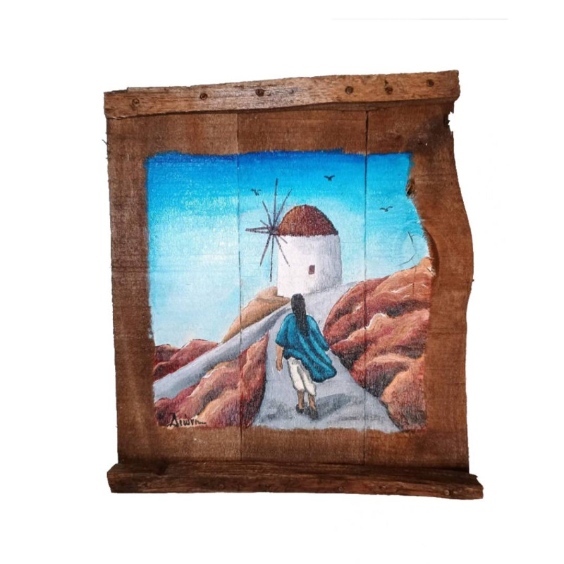 Χειροποίητο έργο τέχνης απο ξύλο που απείκονίζει μία έναν ανεμόμυλο.
